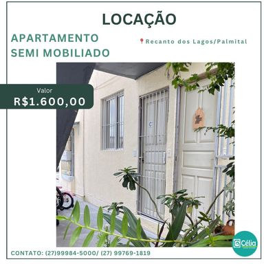 Apartamento - Locação No Residencial Jardim Laguna - Recanto dos Lagos/Palmital. ▪Dois quartos; ▪ Sala estar/jantar; ▪ Cozinha; ▪ Banheiro social; Semi Mobiliado: -Geladeira -Fogão -Coifa - Armários: cozinha e banheiro -Sofá -Cama -Guarda-roupa -Ventiladores Churrasqueira; Salão de festas; Playground; Próximo à padaria, mercadinho, lanchonetes, restaurantes, pracinha... Garagem: uma vaga. R$1.600,00 OBS.: * Taxa condomínio inclusa; * Restrito para pets . Endereço: Av. João Cabral de Melo Neto, 280 - Condomínio Residencial Jardim Laguna. Obs.: -Temos requisitos para locação. -Preço, disponibilidade e informações poderão sofrer alterações sem aviso prévio. Contate nossos consultores. Célia - Corretora de Imóveis (CRECI: 4161/ES)