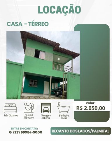 Casa para locação - Recanto dos Lagos/Palmital - Quintal espaçoso - Casa-térreo, com entrada individual - Garagem coberta > 03 Quartos; > Sala de estar; > Banheiro social, com armário sob a pia; > Cozinha, com armários embutidos; > Área de serviço. Valor: R$ 2.050,00 ao mês Endereço: Rua Carlos Drumond de Andrade, 450 – Palmital – Linhares/ES IMPORTANTE: - Temos requisitos para locação; - Preço, disponibilidade e informações poderão sofrer mudanças sem aviso prévio; Favor contatar nossos consultores. Célia – Corretora de Imóveis (CRECI: 4161/ES)